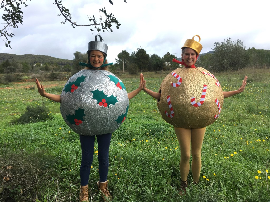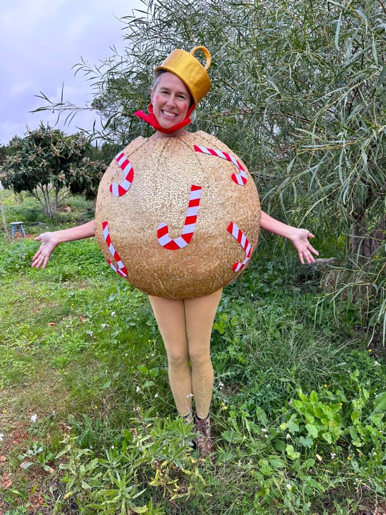 A set of giant Christmas baubles sculpted from cardboard & papier mache and covered with applique textiles, with sculpted cardboard & papier mache hats. Commissioned for ‘Que Miras Produccions’ to take part in Palma Mallorca’s Christmas celebrations in 2024.