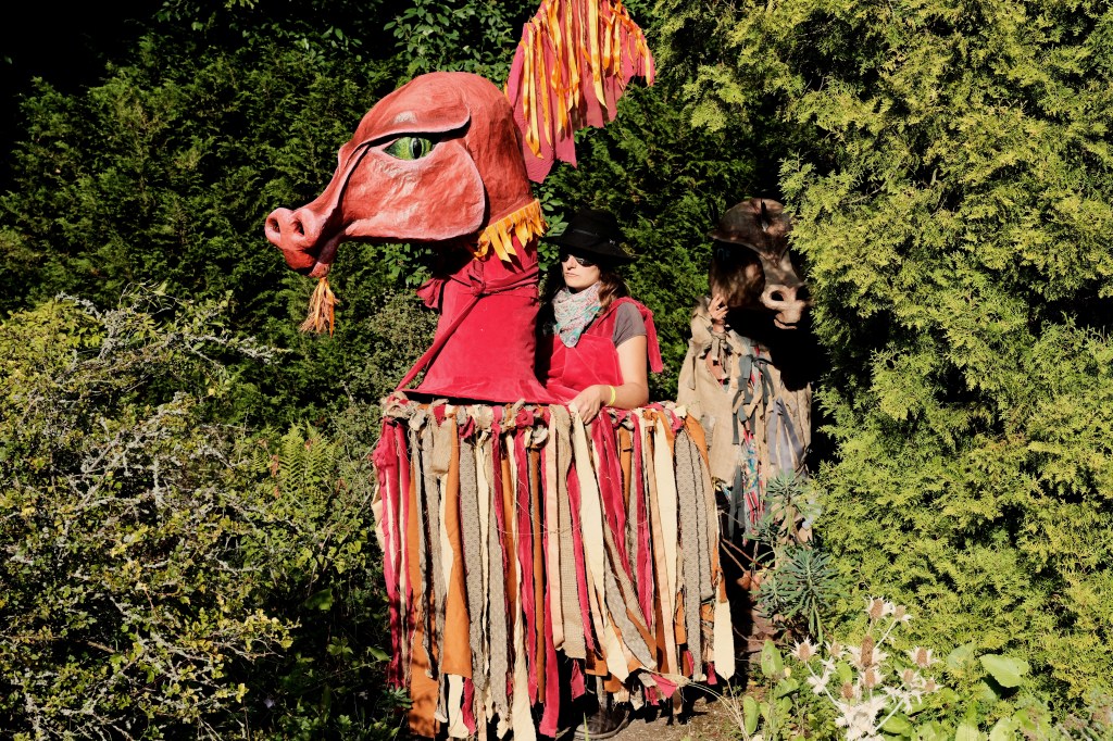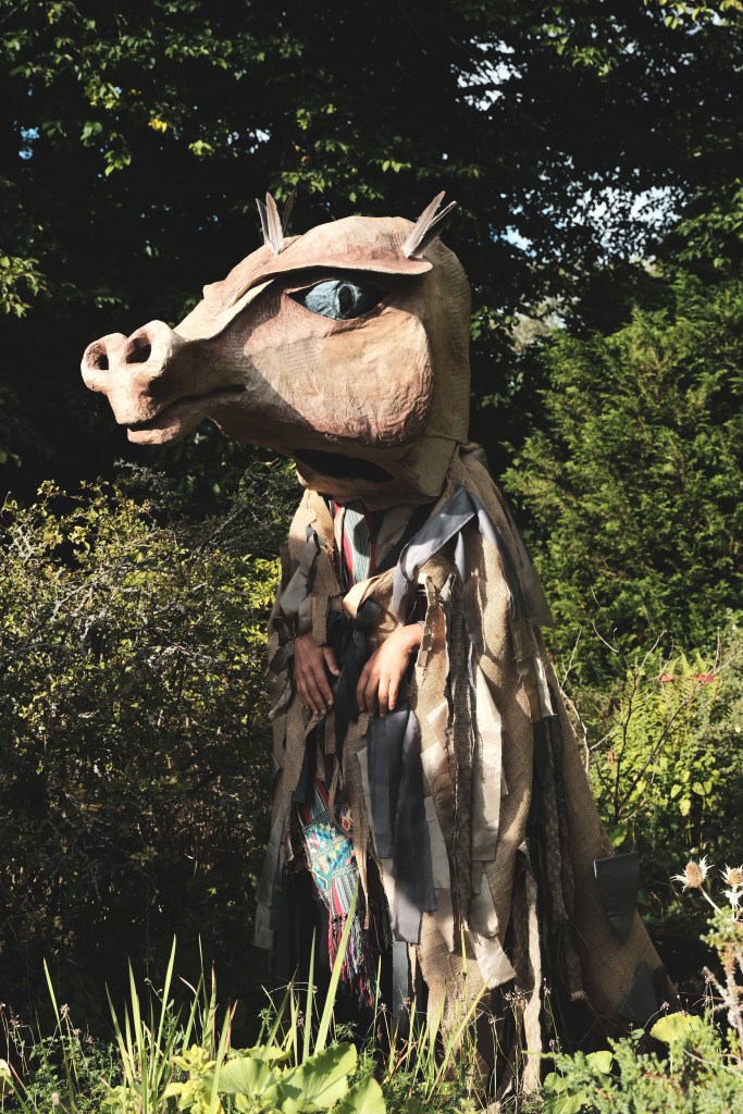This set of two dragon puppets were commissioned for the first ever Oxford Storytelling Festival The fire dragon is inspired by medieval ‘mummers’ folk traditions and the ‘hobby horse’, the water dragon consists of a large scale helmet/mask and costume, also inspired by English mummers folk traditions. The dragons performed in the opening and closing ceremonies of the festival. Materials: sculpted cardboard, hessian, bamboo, reclaimed textiles, acrylic paints.