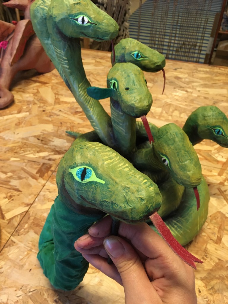 A dragon and a seven-headed serpent commissioned by theatre director Celia Ruiz for her performance ‘Il-luminar-te‘, which was a theatrical labyrinth which took place in the Ses Coves Blanques lighthouse in San Antonio, Ibiza. The puppets came to life in a creation myth told in one of the labyrinth chambers. Materials: sculpted cardboard papier-maché, acrylic paints, coloured metallic foils.