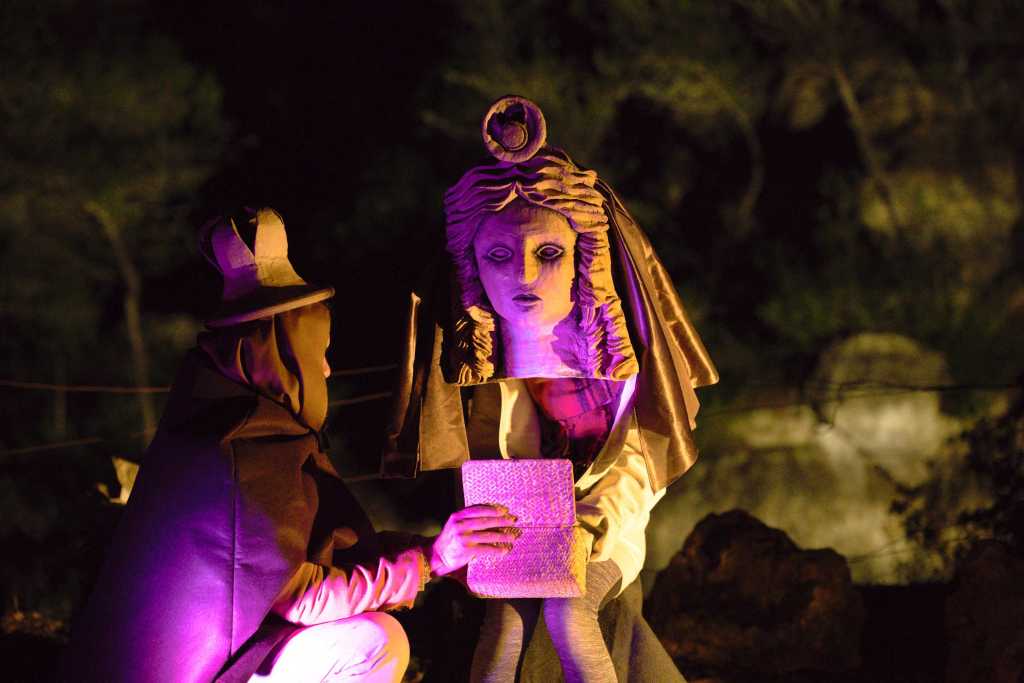 Led in groups of twelve people at a time, audience members were initiated into the Persephone myth via a storytelling guide, reciting texts in English and Ibicenc – Ibiza’s native dialect of Catalan – giant puppet rituals, and live painting performance with the island’s raw earth pigments. Before embarking upon their descent to the Underworld, participants were given an elixir made from local organic Ibizan pomegranates steeped in alcohol. On arrival to the rim of the Underworld – the prehistoric sink hole cave, S’Avenc des Pouàs, in Ibiza’s Santa Agnès – the group undertook a multi-sensory ceremonial journey to the realm of Hades inspired by African initiatory mask rites, before concluding their voyage in a closing ritual by the fire pit.