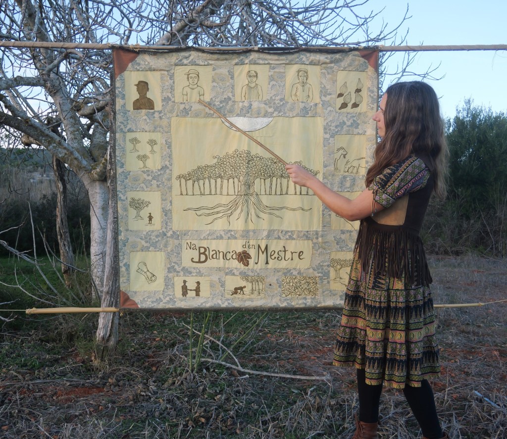 Na Blanca d’en Mestre is a visual storytelling performance based on an ancient street theatre tradition of narrating with an illustrated scroll, one which has been traced back to 6th Century Asia. The piece, which is performed in English, is rooted in the local rural traditions of the Pitiusas Islands, and tells the story of Na Blanca d’en Mestre, a fig tree on Formentera which is said to be the largest in the whole of Spain.